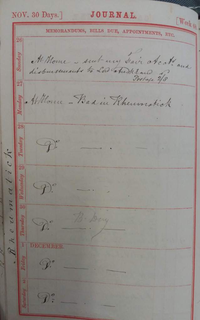 In 1854 John Martin was beginning to feel his age. He was by now 74 years old and had spent the majority of his adult life in the saddle. We know he was baptised in 1780 but we have no clue as to his birthday. The 1854 diary has three entries, in pencil, ‘B Day’. One in October, another in November as here and the other on 28th December. It is reasonable to assume they refer to someone’s birthday but whose is not known.