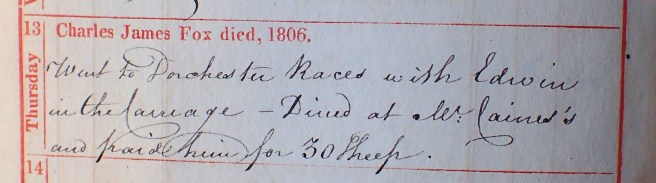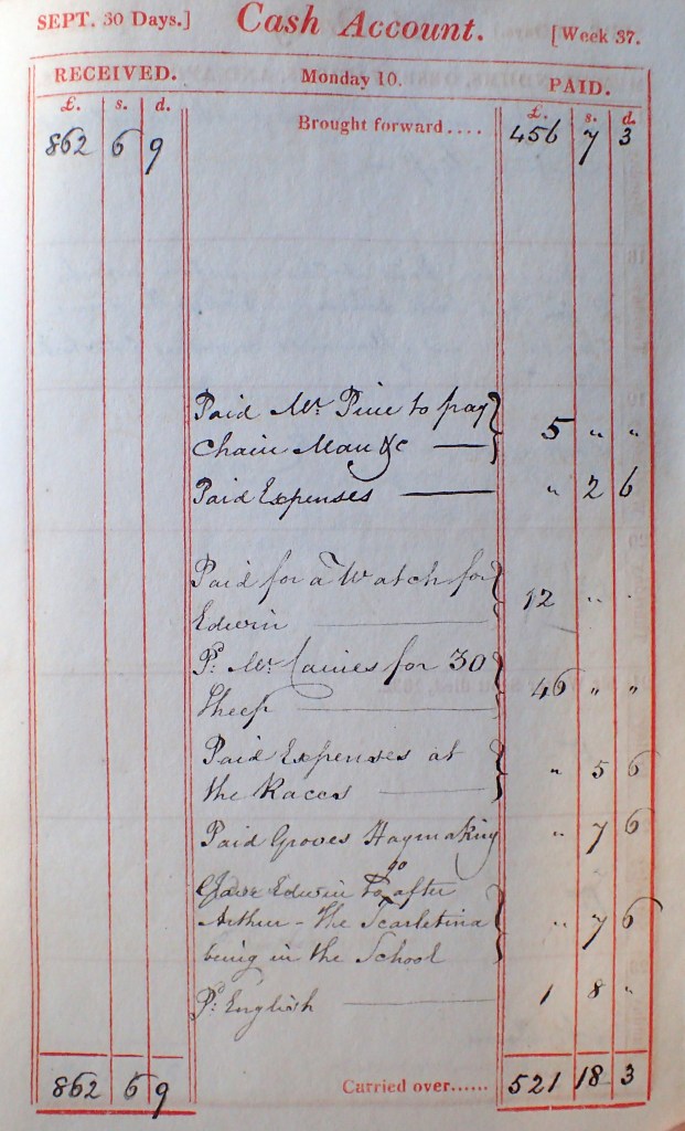 Paid Mrs Martin £5 Paid Stroud of Fordington mending my Carriage £1 16s 8d Paid for Books and paper at Mr Patch’s 12s 4 ¼ d Paid at Dorchester for things 10s |