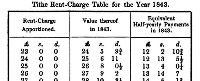 Pyne’s Value of the Tithe Rent-charge gave revised values for the rent-charge each year. If the apportioned rent-charge had originally been £25 then in 1843, the price of wheat, barley and oats having increased, its revised value was £26 8s 0 ¼ d.