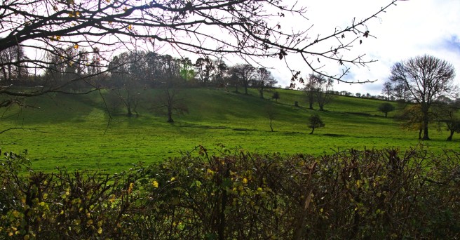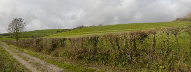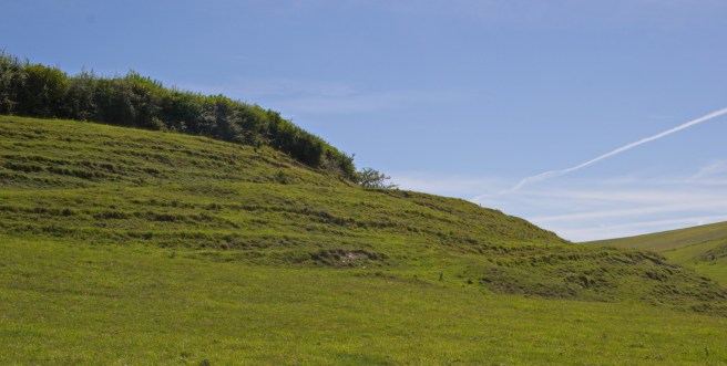 Here we see the left hand valley with the village at its base, surrounded by the higher ridges to the left and the central ridge at the top of the picture. This was down land note how, in order to improve drainage, the selions on the left hand side slope downwards to what, in Martin’s day, constituted a small stream. This may have been a ‘winterbourne’, a stream that was dry for much of the year and only ran in wet weather, most obviously the winter months. Near the village the 6” OS map from 1887 shows two springs feeding it near the village but Martin shows it arising further up the valley. A more substantial road leads out of the village towards Wraxall and runs up to the central ridge. As this was almost certainly common pasture on the downs it did not need to go further. It might be wondered why the selions on the right hand side, which are larger and fewer, do not run in the same direction as those on the southerly, left hand side. The answer is that although they are strip like they are not in fact open field selions. The photograph below reveals their true nature.
