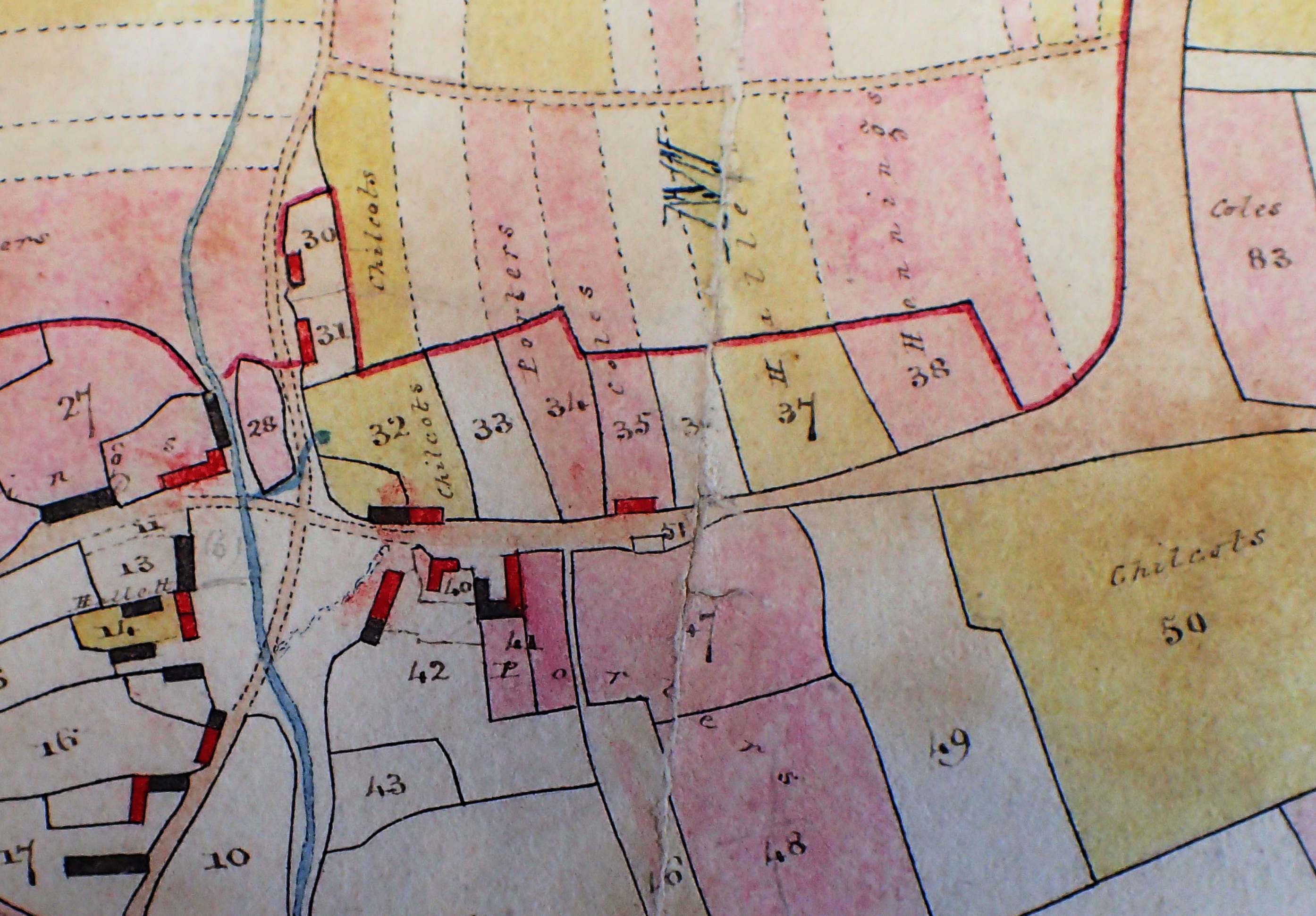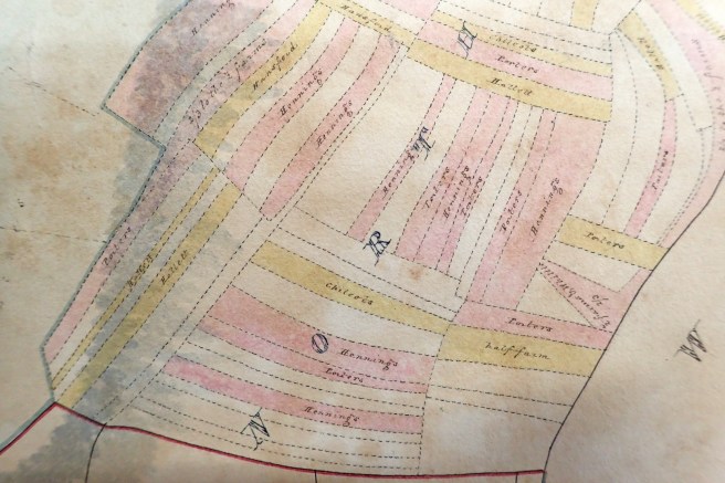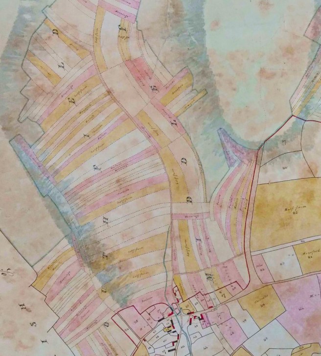 As these maps were made for two specific owners, Lord Sherborne and Mr Luxmore only their lands are shaded and named. The selions have been colour coded according to the tenures, those in gold being ‘in hand and upon lives held entire’. The red are ‘held in individual moieties’. The exact meaning of these terms can only be guessed at but it is interesting to note that there was no clear distinction between ‘open field’ farms and inclosed farms. It was what we might call a mixed economy in that the farms had a mixture of both old inclosures and strips.