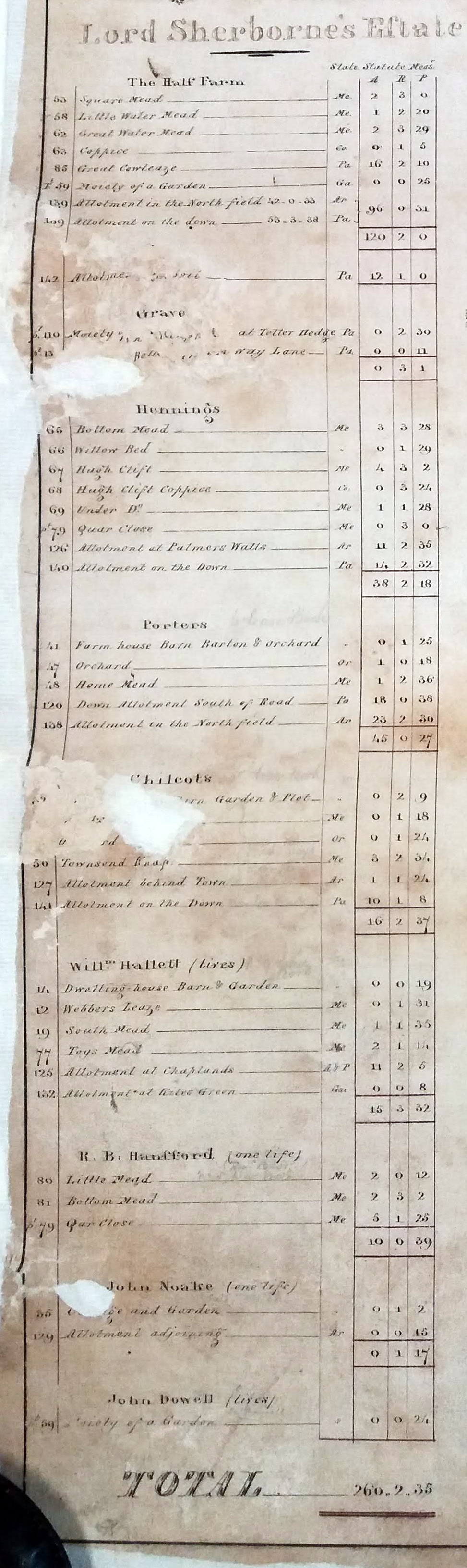 The post-inclosure map appears to have been prepared for Lord Sherborne and on the left hand side of the map is a list of the various estates in land that he owned in the parish.