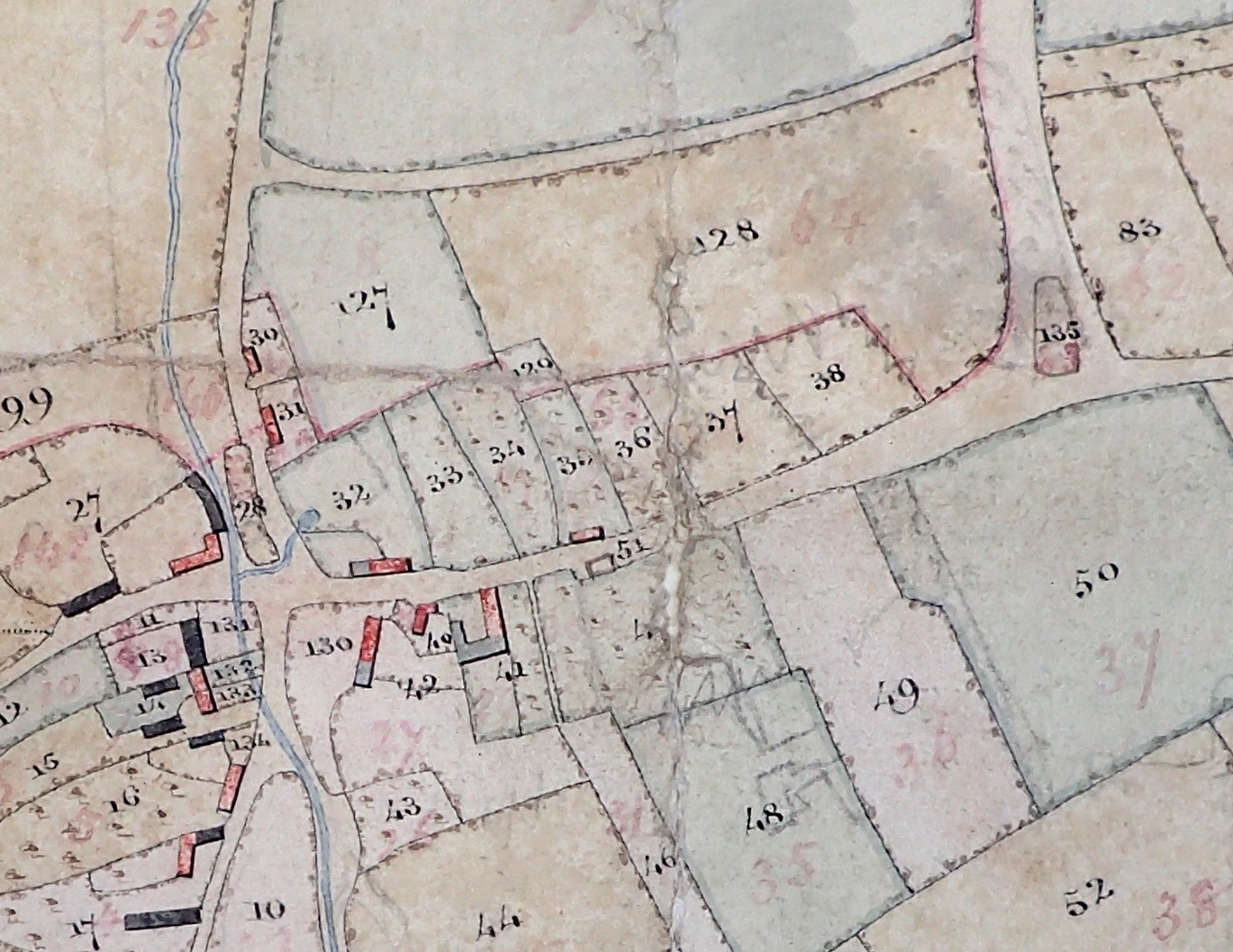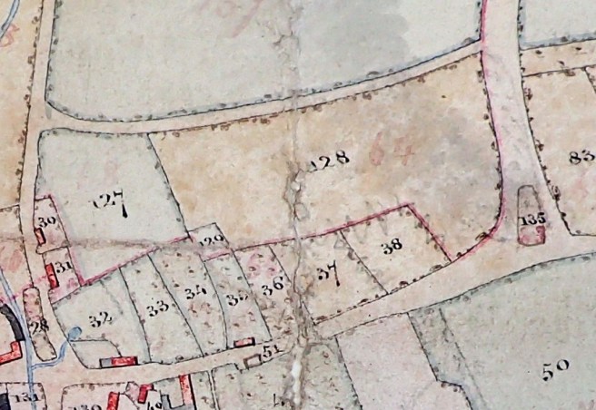 By the time of the tithe map [1842] plot 135, a plantation has filled in the gap to the left narrowing the road to the common. By the time the 1887 6” OS map was compiled all that remained was a foot path. The green lane out of the village running past plots 127 and 128 became and remains the principal road out of the village. The old lane has now become completely wooded, a track remains but is now just a footpath/bridleway.
