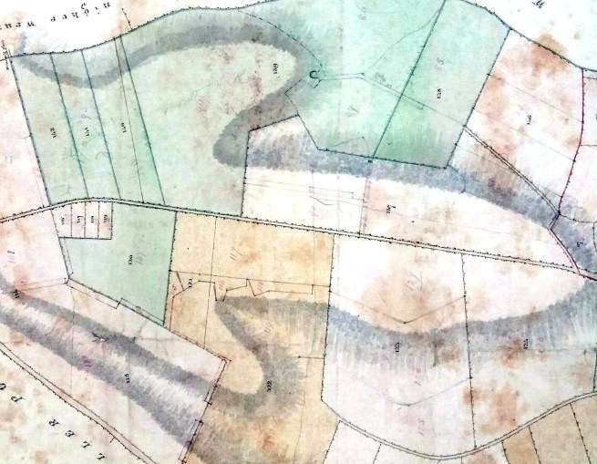 These maps have not survived well, they have had to be remounted and the number of document weights needed to flatten them indicates how curly they have become. The image has had to be edited and the colours enhanced in this picture of the pre-inclosure map. Note the ‘hachuring’ [in blue] which was an early attempt to denote the contours of hills. The represent the edges of the ridges that form the valleys. The principal habitation lies at the bottom of one of the blind valleys with a central ridge where the W is. On the other side of the ridge where ‘NORTH’ is there is a gentle slope down to lower Wraxall. The central ridge and surrounding ridges were uncultivated and formed the common pasture or waste.