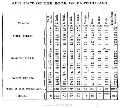 Finally there were ‘old inclosures’; these had to be included in the valuation of the whole manor but were generally not a part of the land to be redistributed.The value of the inclosures was deducted from their owners value.