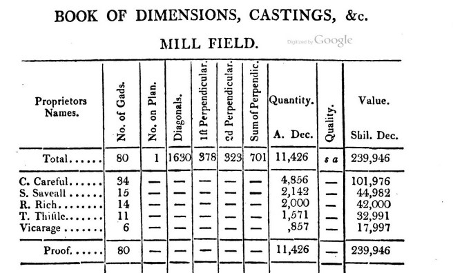 Armed with the map and book of qualities together, with the book of particulars the surveyor was now able to calculate or cast the area of the parish and the total value of the parish together with the value of each owners holdings.