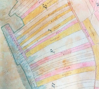 This is a small section of John Martins pre-inclosure map of Chilfrome. The map was a private commission for two of the landowners and was not directly linked to the inclosure. The different colours represent different estates and show how the selions were intermingled.