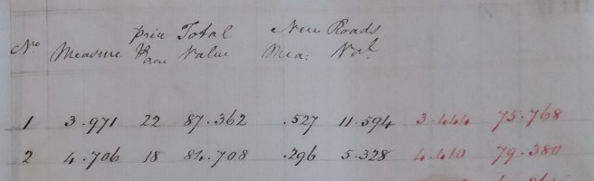 This is a small part of the Rampisham inclosure general survey book concerned with the new roads. On the far left is the number on the map through which the road passes. The total area and value of the section is given and next the amount taken for the new road together with its value in shillings. Note how the value of the land and hence the road varies as it passes from region 1 of the land to region 2. The numbers in red give the revised area and value of the sections.