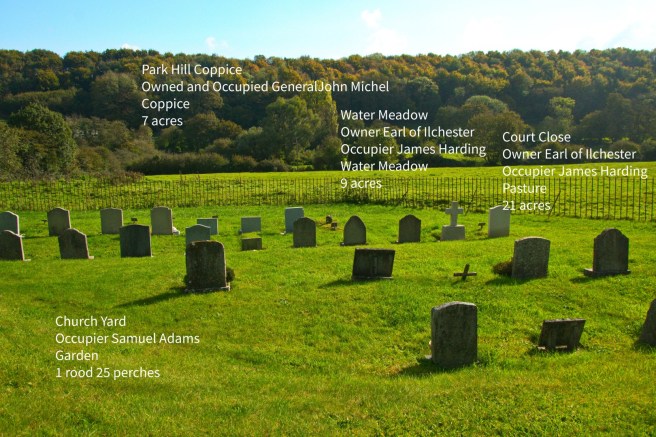 The two landowners in Dewlish apportioned the rent-charge over their whole estates so that individual plots were not apportioned a particular amount. Martin listed Cottage and Gardens in one place and unusually the Church yard is included with other ‘gardens’. It even had it’s own occupier – Samuel Adams.