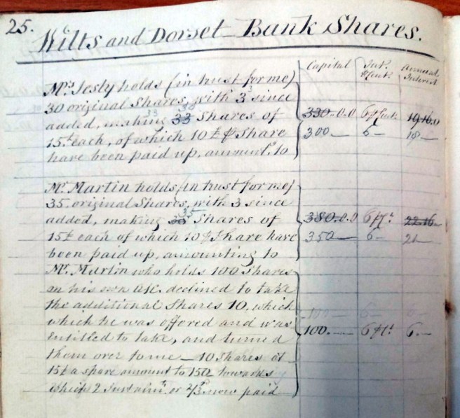 The Napoleonic wars saw an almost doubling in the number of banks and the bankers prospered greatly; overconfidence and speculative investment [even to the extent of investing in a non existent country] led to a banking crisis in 1825 in which ninety three banks [out of a total of six hundred or so] failed. In 1826 a new banking act allowed for private ‘joint stock banks’ to be established. These had a much larger funding base and in 1835 the Wilts & Dorset Bank was founded at Salisbury [4] with an initial capital of £150k which rapidly increased to £300k being funded by shares priced at £15 each. From William Jennings’s account book he notes that John Martin held shares from the outset, some of them being held in trust for Jennings himself.