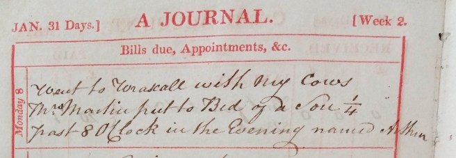 8th January 1827 : Went to Wraxall with my Cows Mrs Martin put to Bed of a Son ¼ past 8 O’Clock in the Evening named Arthur