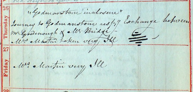 April 26th & 27th : Godmanstone Inclosure Journey to Godmanstone respg Exchange between Mr Goodenought & Mr Bridge Mrs Martin taken very ill.