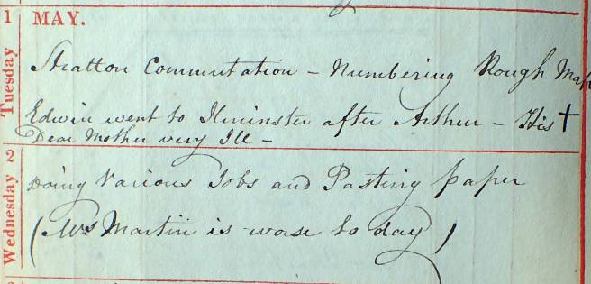 1st May : Stratton Commutation -numbering Rough Map Edwin went to Ilminster after Arthur His Dear Mother very ill Gave Edwin 5s 2nd May : Doing Various Jobs and Pasting paper (Mrs Martin is worse today)