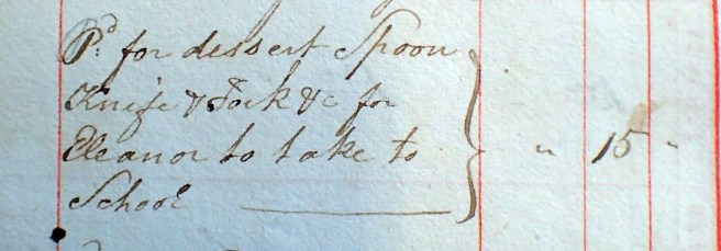 7th July 1827 .Pd for dessent Spoon Knife & Fork &c for Eleanor to take to School 15s