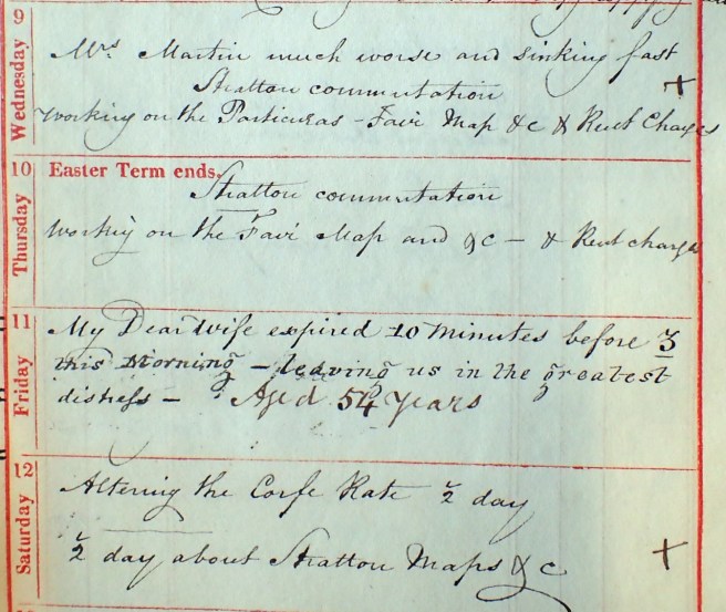 | 9th May 1838 | Mrs Martin much worse and sinking fast Stratton Commutation Working on the Particulars – Fair map &c & Rent Charges |