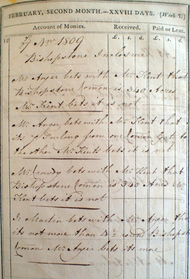 | 27th Nov 1809 Bishopstone Inclosures “Mr Anger bets with Mr Kent that the Bishopstone Comon is 340 acres Mr Kent bets it is not Mr Anger bets with Mr Kent that its 7 Furlong from one Comon Gate to the other Mr Kent bets it is not Mr Crowdy bets with Mr Kent that Bishopstone Comon is 340 Acres Mr Kent bets it is not J Martin bets with Mr Anger that it is not more than 4 ½ around Bishopstone Comon Mr Anger bets its more” |
