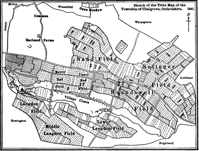 The drawing above shows the open fields of Chalgrove in Oxfordshire. The common arable fields are filled with hundreds of hatched strips [ = = =] but in large parishes their could be quite literally thousands of these strips. The strips are seperated from each other by solid lines which are baulks [balks] which allow access to the strips from the green lanes that comprise the roads of the village. The strips were often grouped together into what were called furlongs and were orientated in a way that allowed for easy ploughing or drainage.