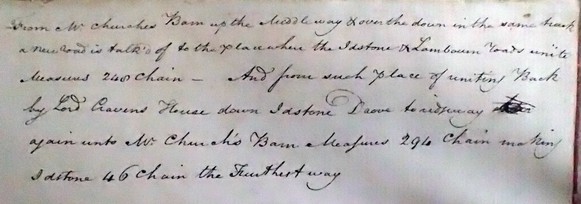 From Mr Churches Barn up the Middleway & over the down in the same track a new road is talked of to the place where the Idstone and Lambourn Roads unite Measures 240 chains – And from such place of uniting Back by Lord Cravens House down Idstone Drove Ridgeway again unto Mr Church’s Barn measures 294 Chain making Idstone 46 chain the Furthest way