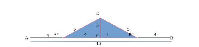 Two surveyors are walking from A to B. The first walks along a flat surface and measures the distance as 16 units. The second has to take the route over the hill and he measures the distance as 18 units.