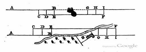 The line A I is obstructed by trees in the upper example and by a river and buildings in the lower. Three offsets C D an E are made [to ensure they are parallel to AI and the line is then continued along from C to F. Three more offsets are then used to ‘rejoin’ the main line AI. Even triangles could be constructed from measured lengths.