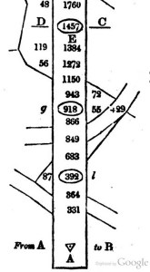 The crossing point of each road, field, stream, river or ‘stations’ as they were known were marked off where they crossed the line. At this stage the readings do not have to be to scale and this can be seen easily. The line DC is crossed at 1457 links and just above that is the number 1760 a difference of just on 300 links yet the distance between these two numbers is about the same as between 1760 and 1865 yet it has a difference of just 100.