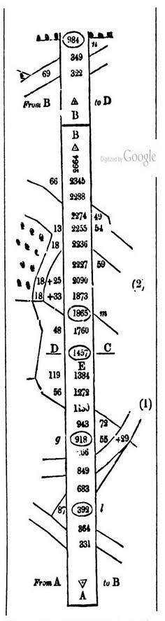 Having determined where the lines should be, the next task was called ‘running the lines’. The survey book, which in this case is not linked to the above map, was divided into three columns. The starting point, in this case the dot within the triangle labelled A, was always at the bottom of the line and the page. On either side of the central column is written From A on the left and to B on the right, thus giving the direction of travel. When point B was eventually reached a line was drawn across the central column. The surveyor fixed his first arrow at point A and set off along the line. The numbers within the column represent the number of links from the starting point. [12] At point B it will be seen that this is 2664 links which represents a distance of 26 chains and sixty four links. Where the line AB intersects with another base line, or a connecting line inserted to create as secondary triangle, the number is circled.