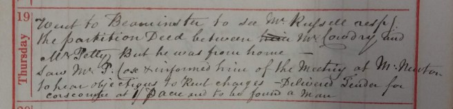19th April 1838 : Went to Beaminster to see Mr Russell respg the partition Deed between Mr Cowdry and Mr Petty But he as from home – Saw Mr P Cox and informed him of the Meeting at M Newton to hear objections to Rent charges -Delivered tender for Corscombe at 1/- acre and to be found a man