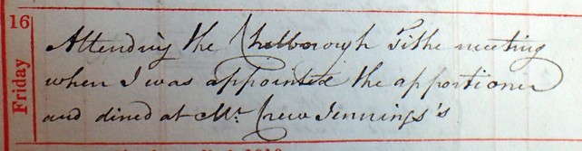 16th November 1838 : Attending the Chelborough Tithe meeting when I was appointed the apportioner and dined at Mr Crew Jennings’s