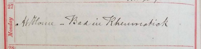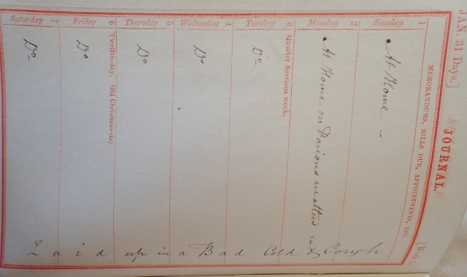 If the depth of his knowledge was considerable then the length of his career was remarkable. As he got older the amount of his professional work work declined- but not until he was in his 70’s. In part this is understandable ; there were fewer parishes to inclose, the commutation work had ceased and with age there must have been a reluctance to spend too much time in damp cold fields. Moreover the 1854 diary has a number of pages on which, down the edge of the page he records that he was “Troubled with the Rheumatick”. The worst spell came at the end of the year when from the 27th November to the 13th December he was suffering particularly badly and the entries read the same.